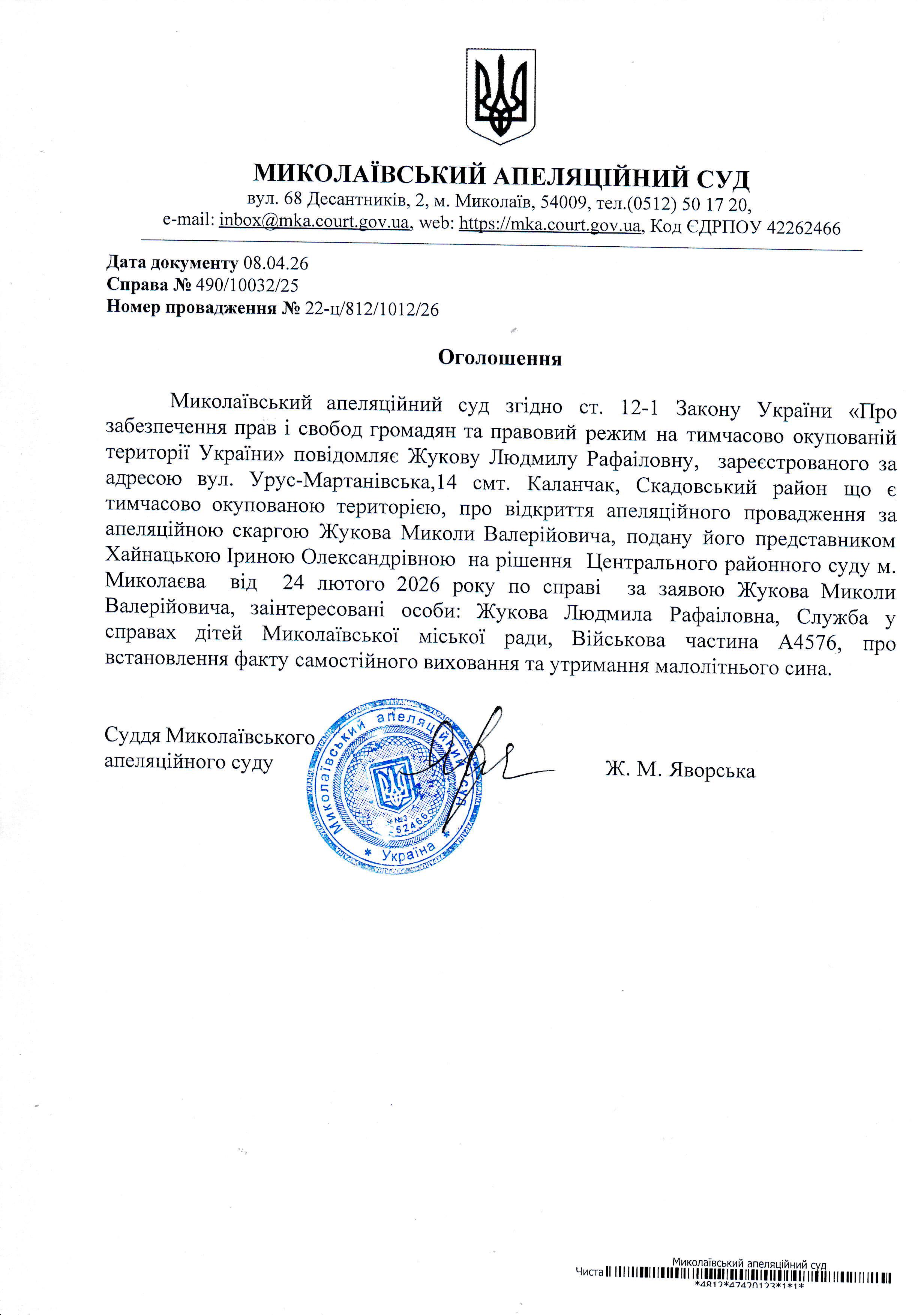 Миколаївський апеляційний суд повідомляє Жукову Людмилу Рафаіловну про відкриття апеляційного провадження