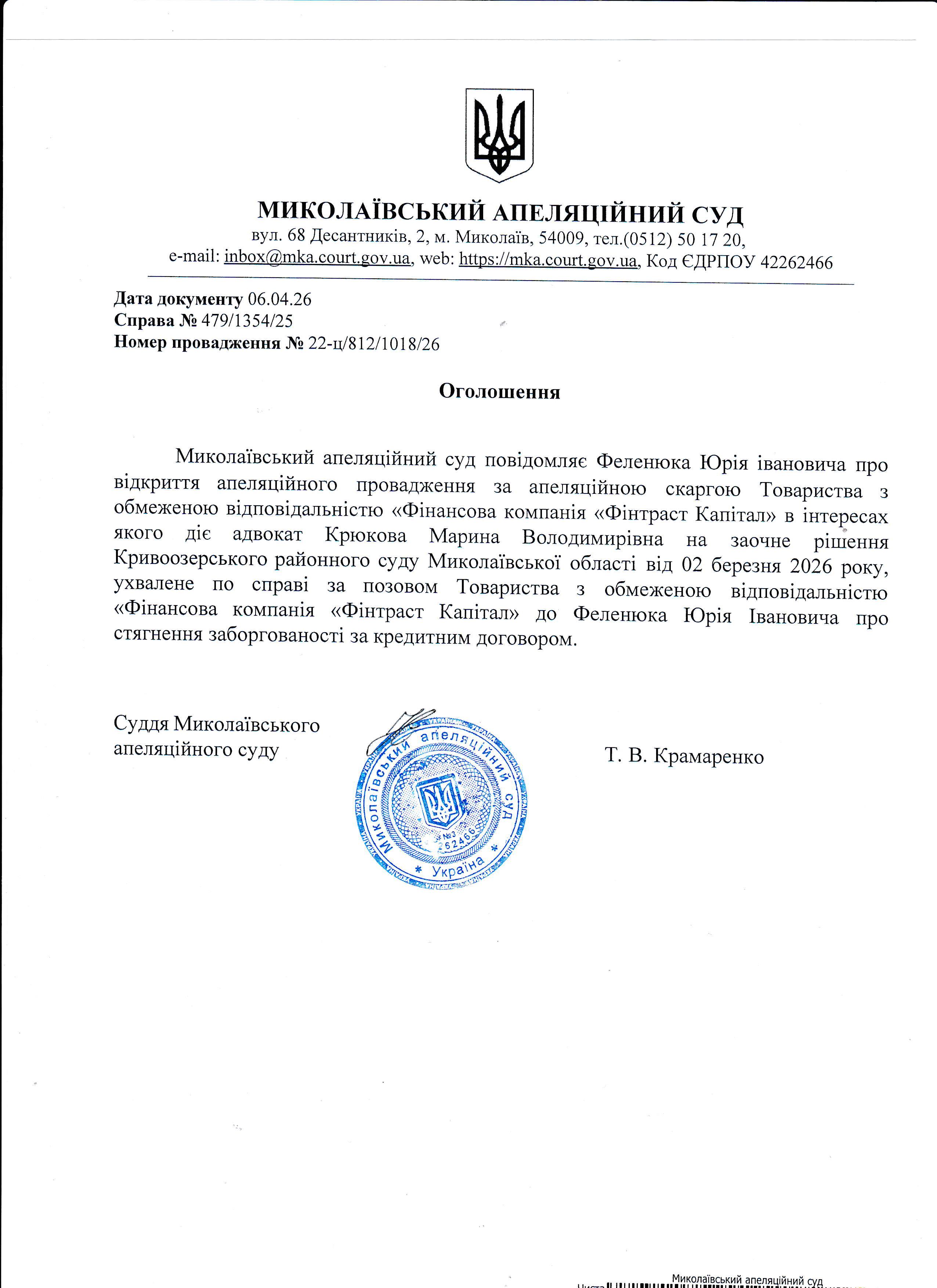 Миколаївський апеляційний суд повідомляє Феленюка Юрія Івановича про відкриття апеляційного провадження