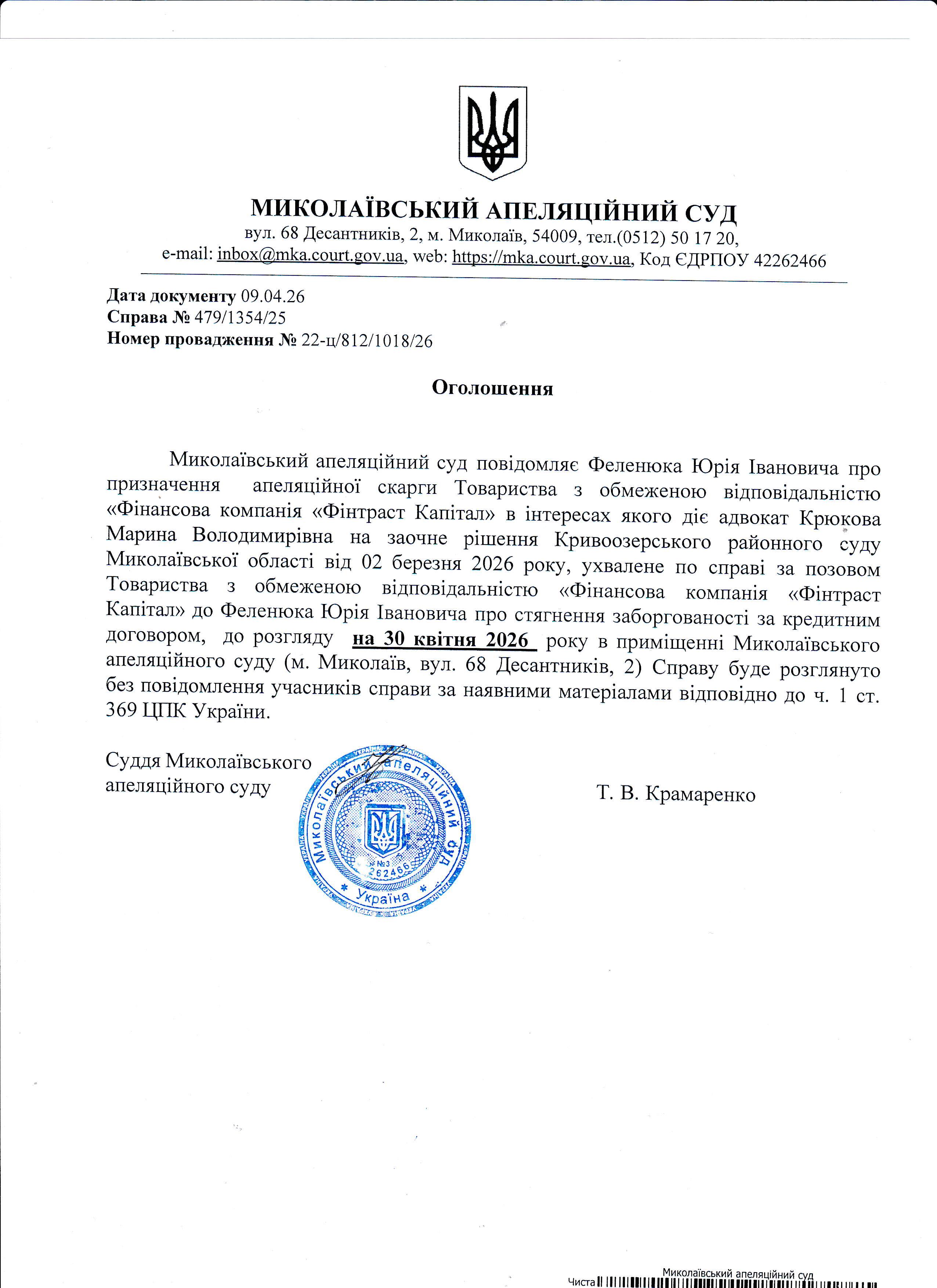 Миколаївський апеляційний суд повідомляє Феленюка Юрія Івановича про призначення апеляційної скарги до розгляду на 30 квітня 2026 року