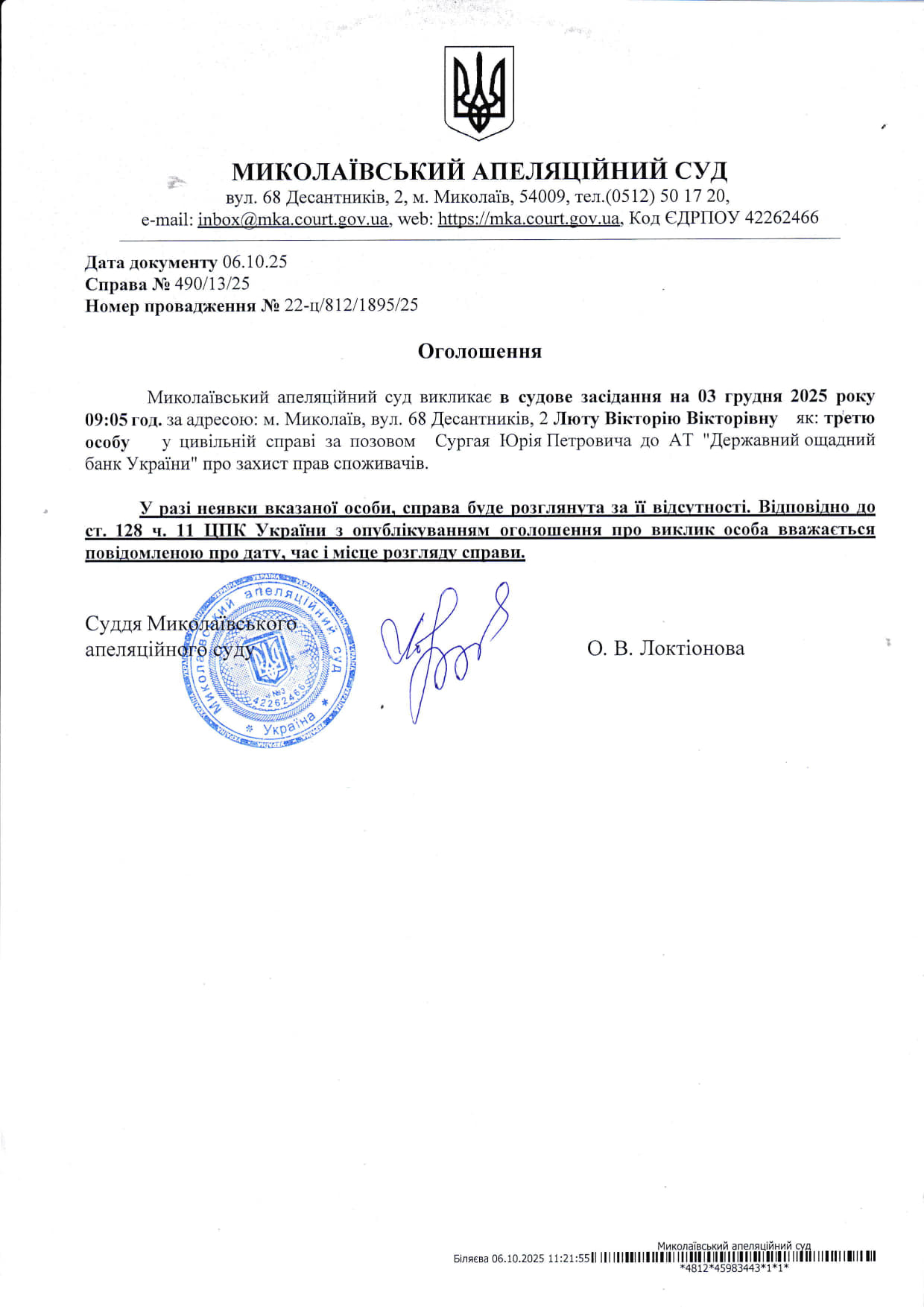 Оголошення про виклик Люту Вікторію Вікторівну в судове засідання на 03 грудня 2025 року