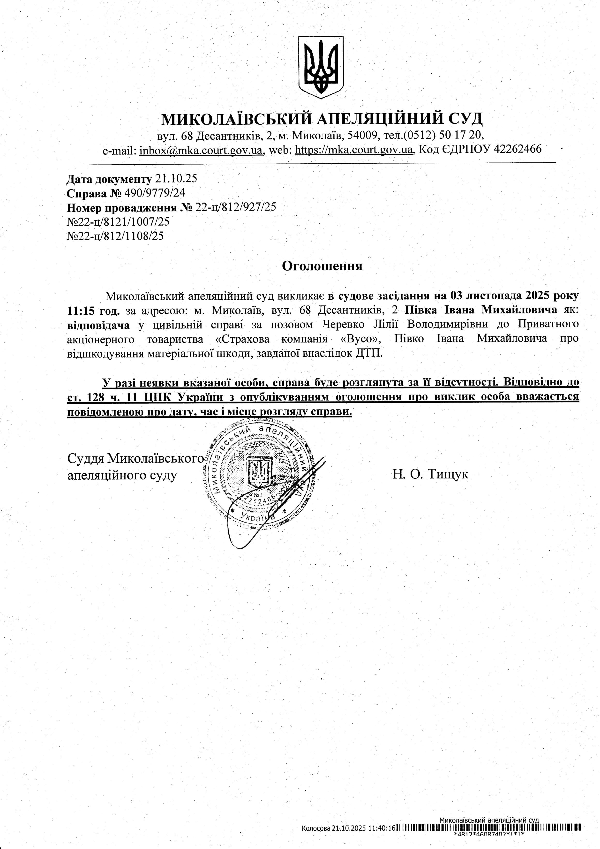 Оголошення про виклик Півка Івана Михайловича в судове засідання 03 листопада 2025р.