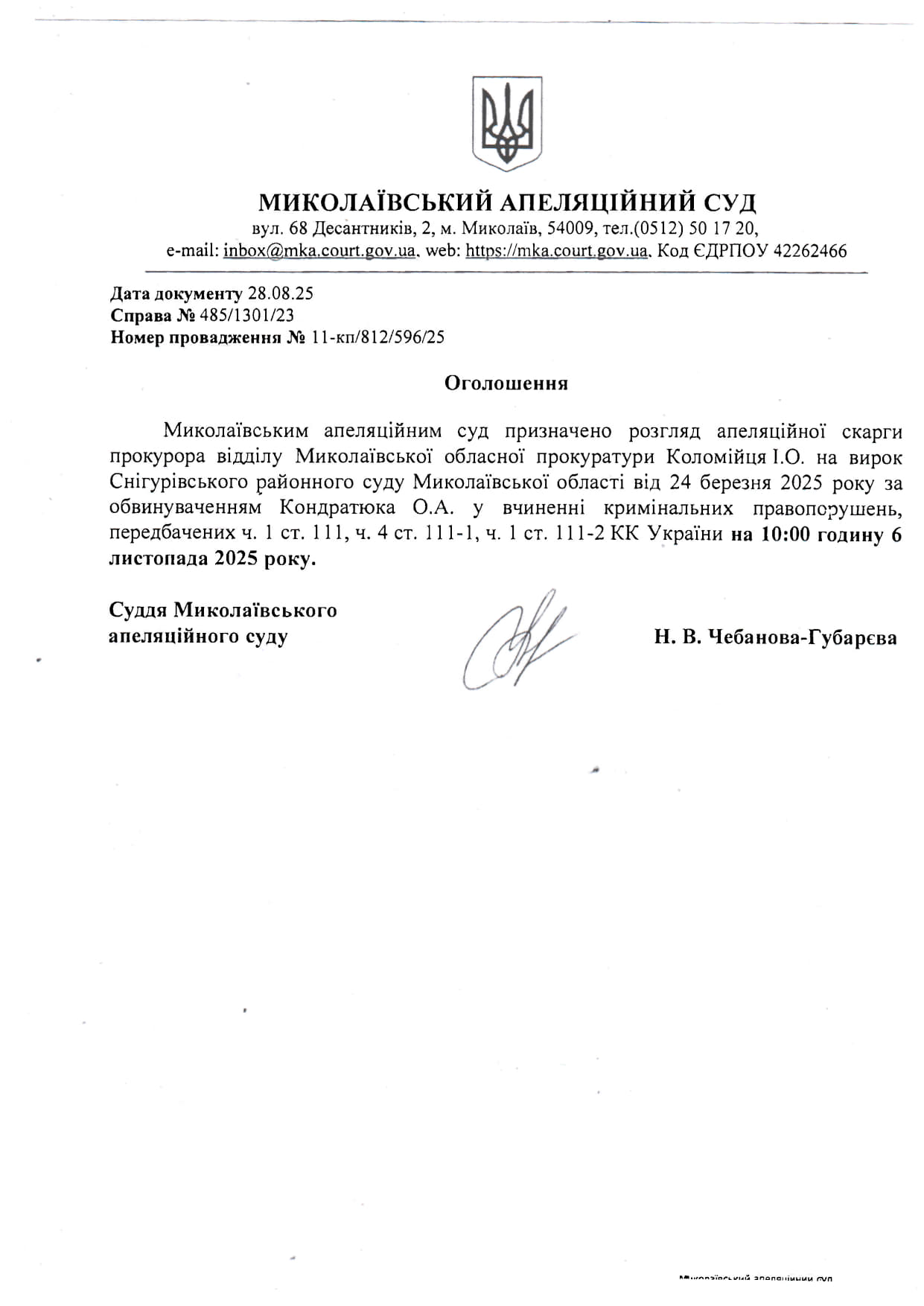 Оголошення про розгляд апеляційної скарги за обвинуваченням Кондратюка О.А 6 листопада 2025 року.