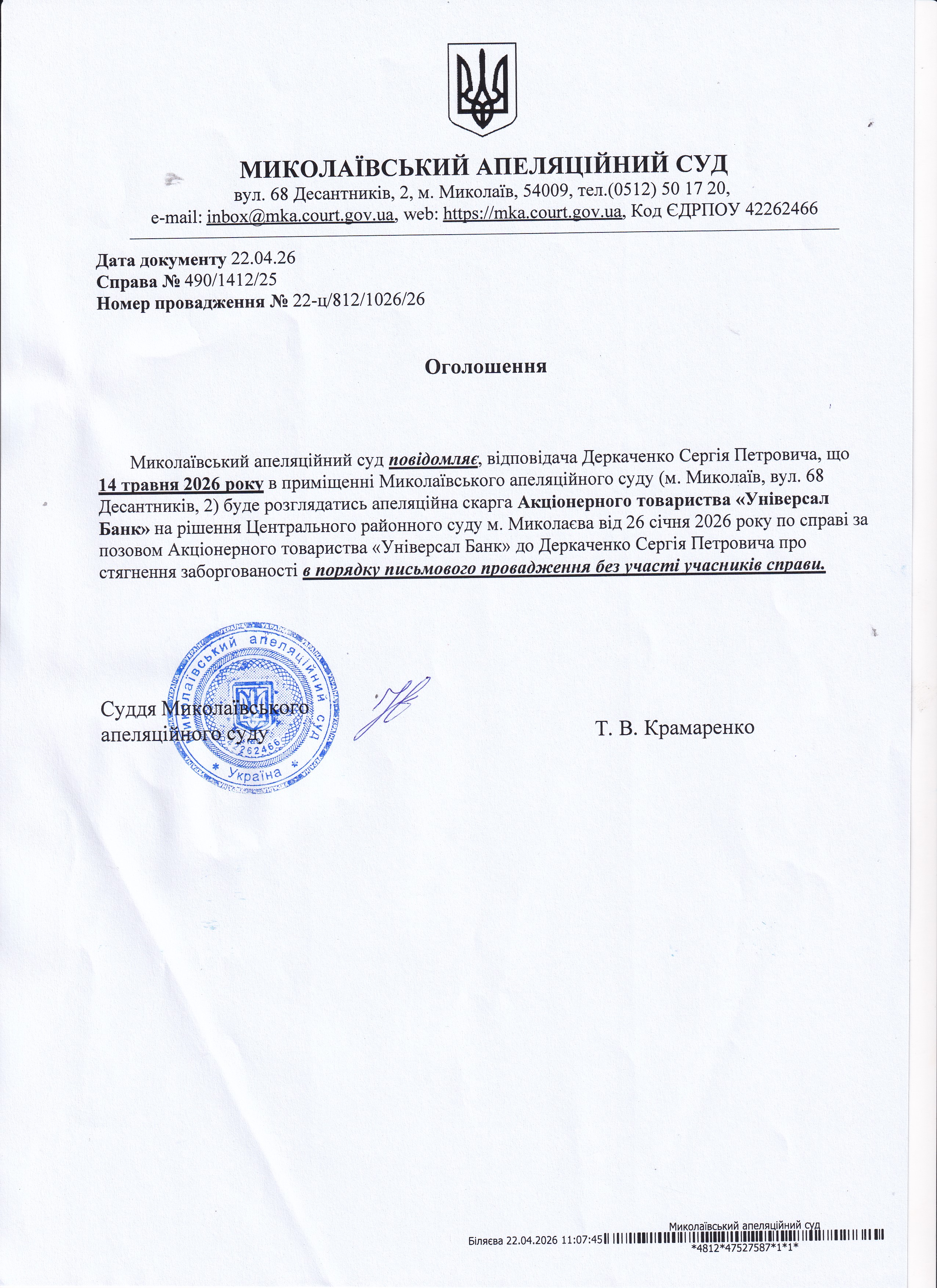Миколаївський апеляційний суд повідомляє відповідача Деркаченко Сергія Петровича, що 14 травня 2026 року буде розглядатись апеляційна скарга в порядку письмового провадження без участі учасників справи