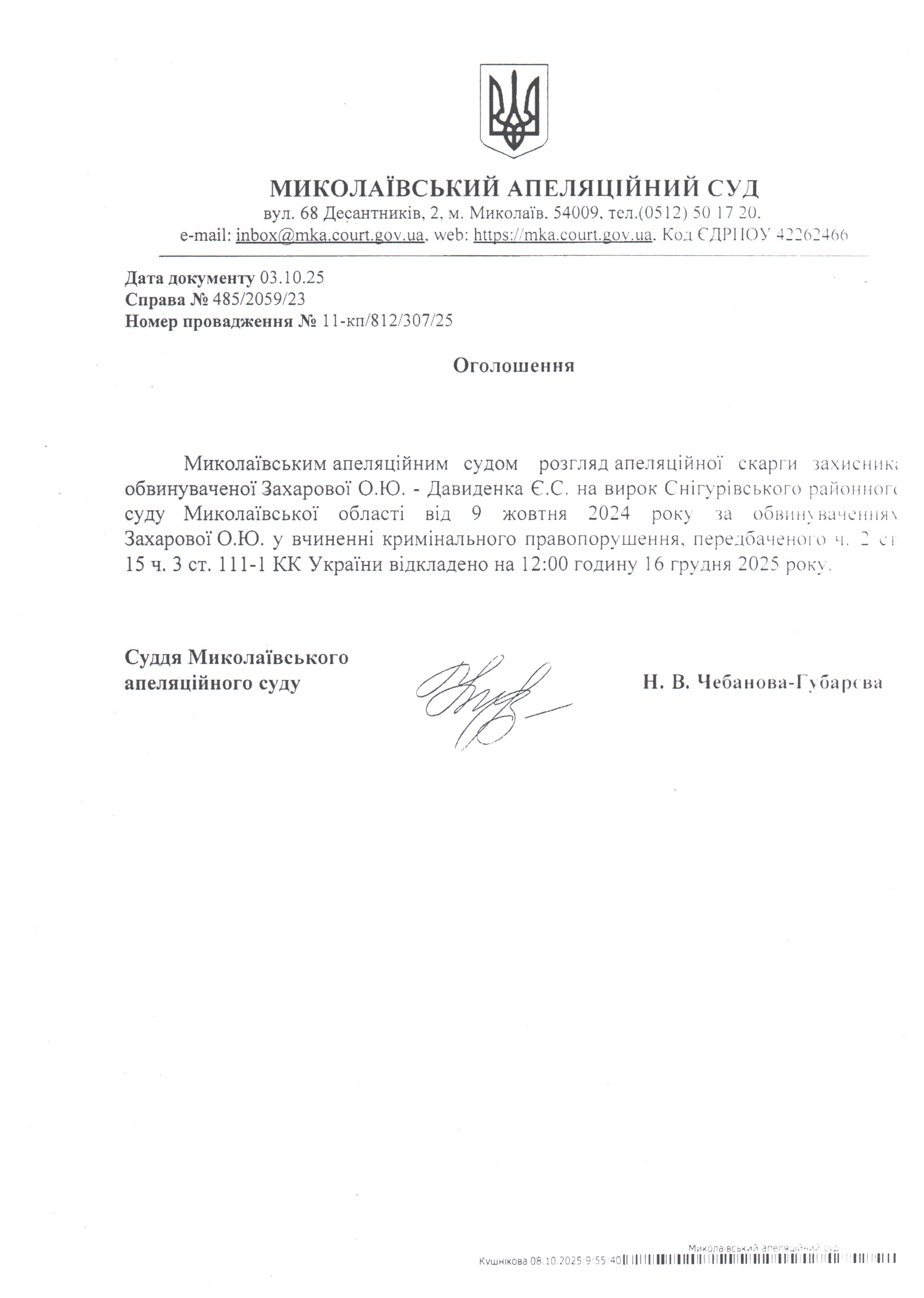 Оголошення про відкладення розгляду скарги захисника Захарової О.Ю.- Давиденко ЄС. на 16 грудня 2025 року