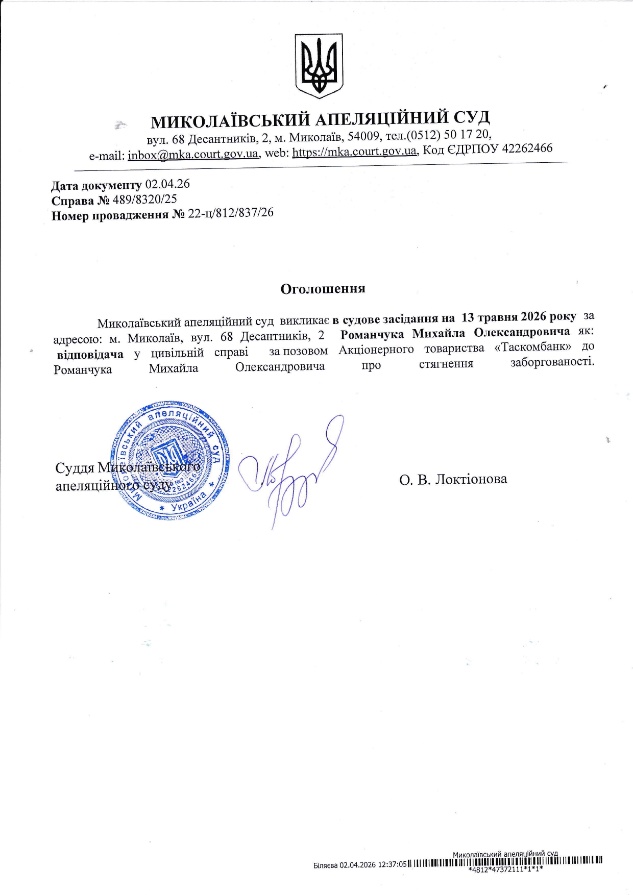 Оголошення про виклик Романчука Михайла Олександровича в судове засідання яке відбудеться 13 травня 2026 року