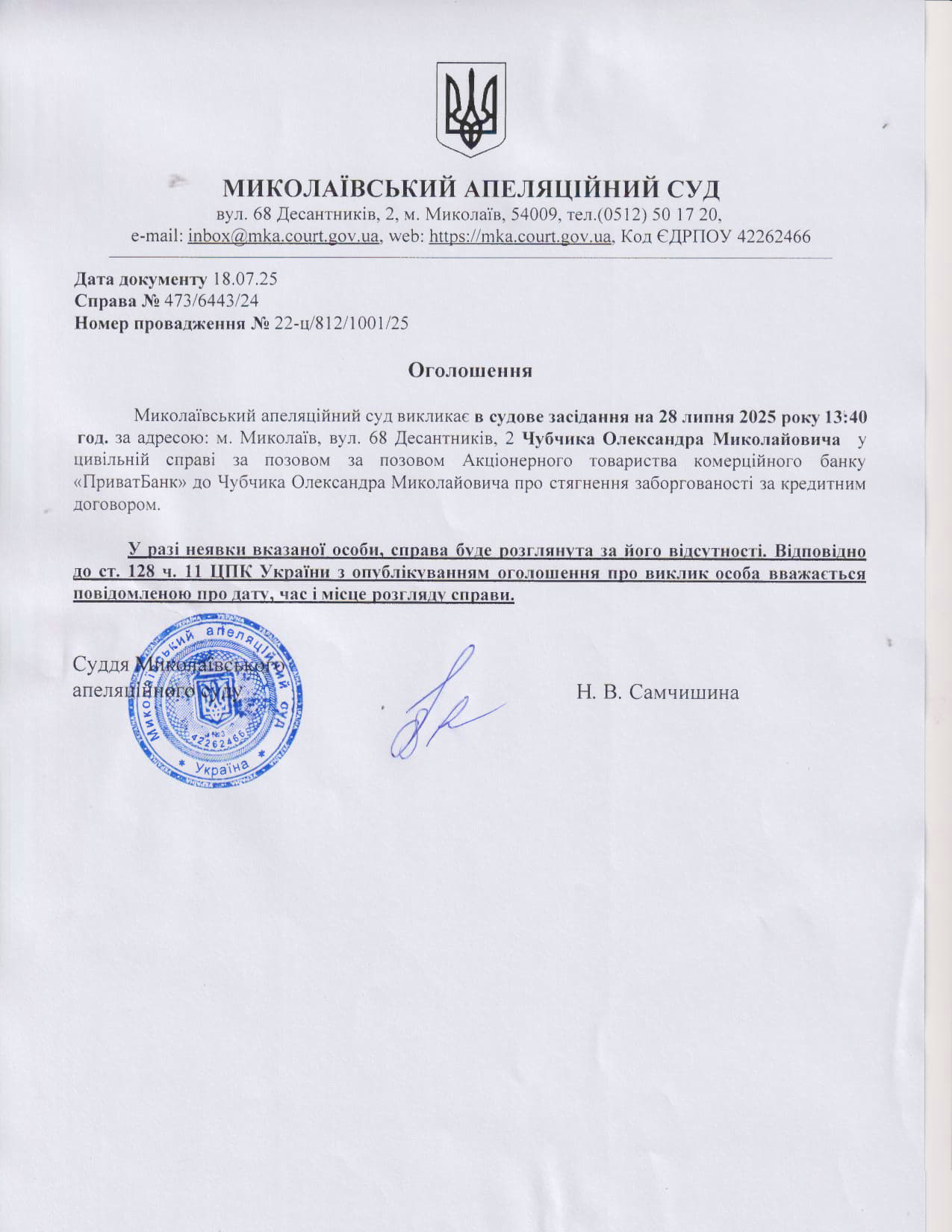 Оголошення про виклик Чубчика Олександра Миколайовича в судове засідання на 28 липня 2025 року