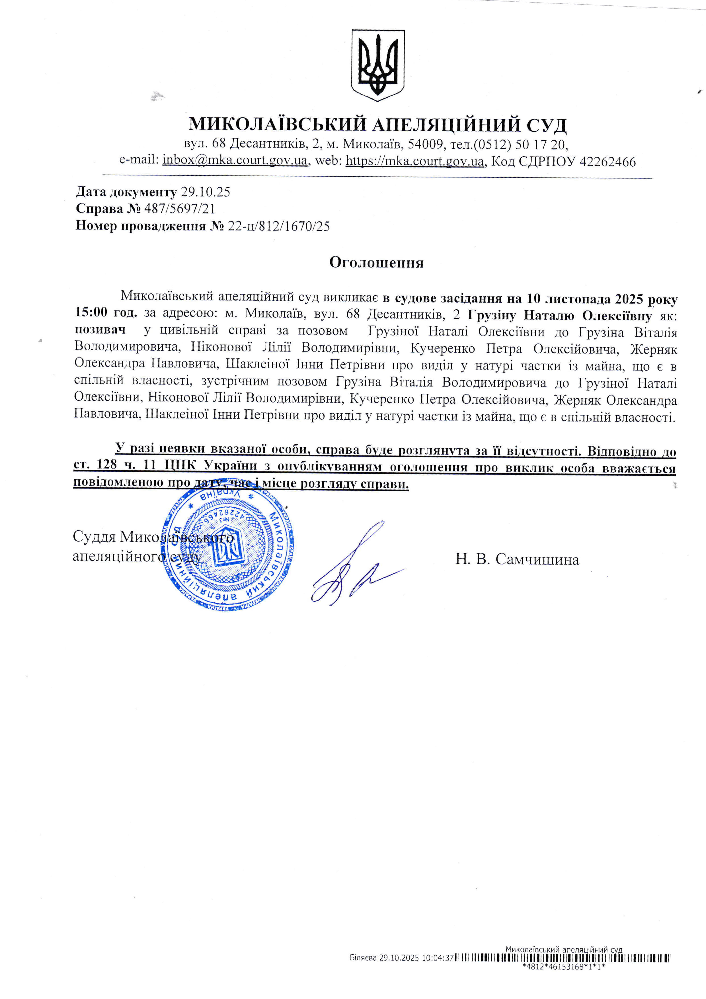 Оголошення про виклик Грузіну Наталю Олексіївну в судове засідання на 10 листопада 2025 року