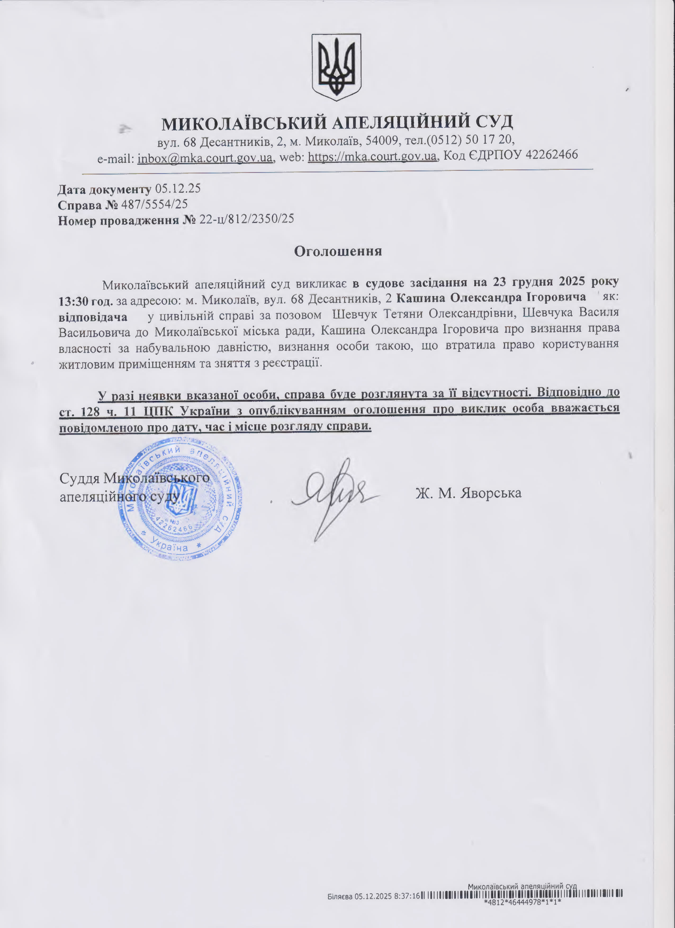 Оголошення про виклик Кашина Олександра Ігоровича в судове засідання яке відбудеться 23 rрудня 2025року
