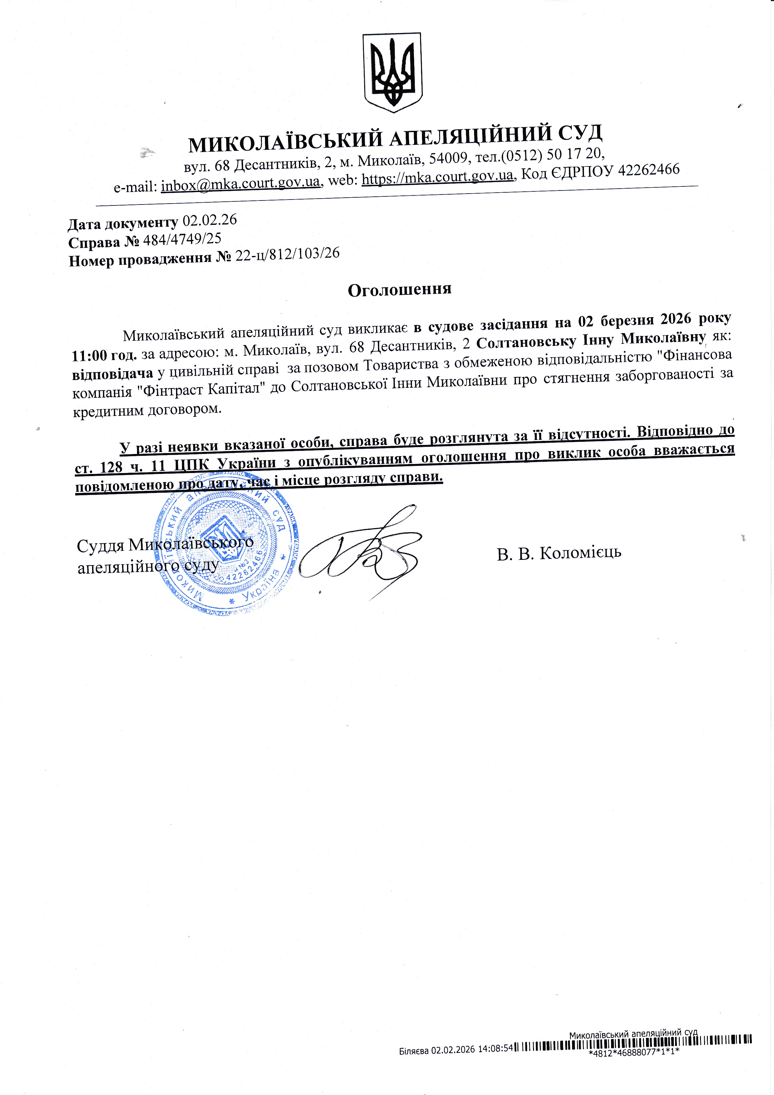 Оголошення про виклик Солтановської І.М. в судове засідання 02 березня 2026 року