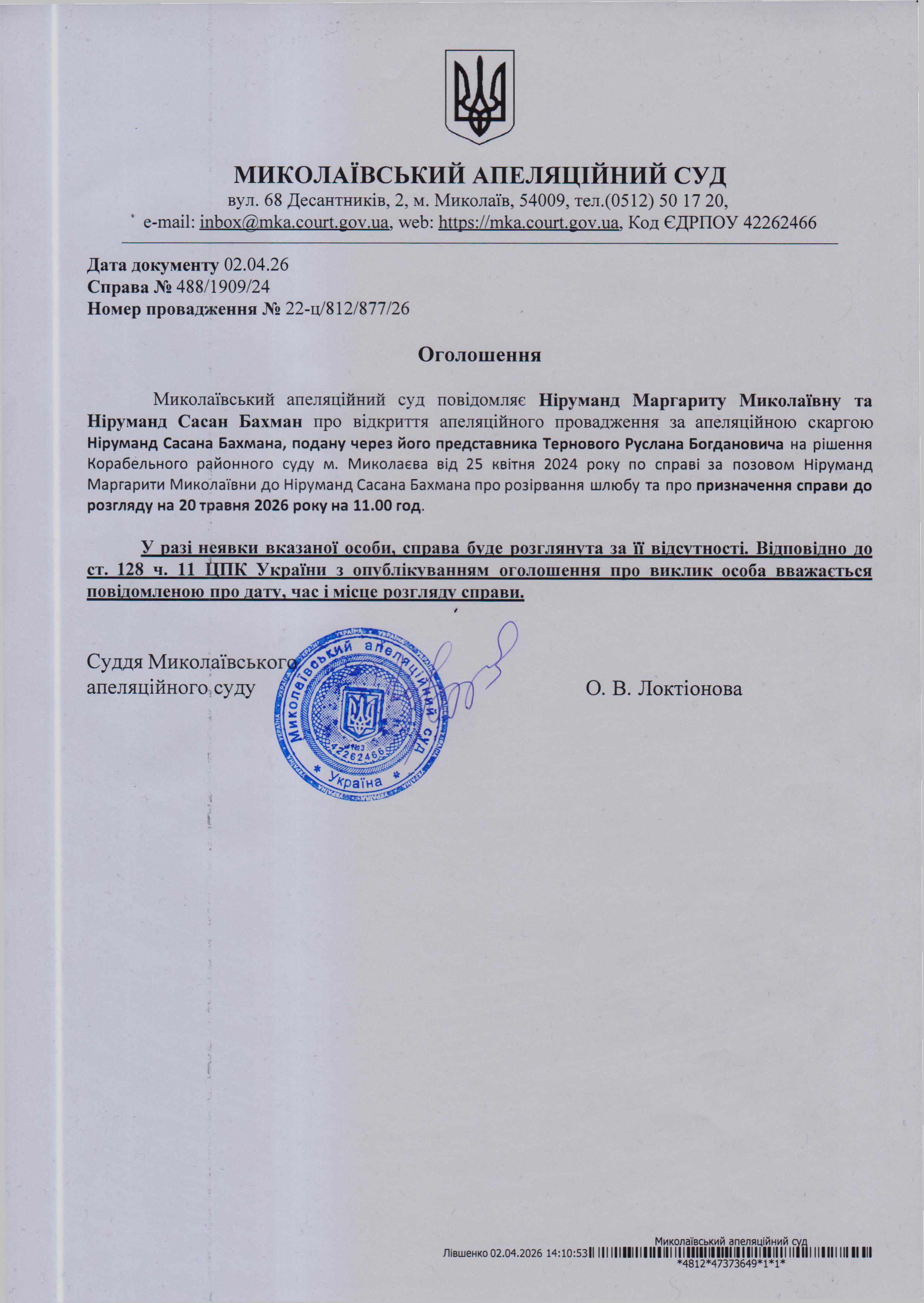 Повідомлення Ніруманд Маргариту Миколаївну та Ніруманд Сасана Бахмана про відкриття апеляційного провадження та про призначення справи до розгляду на 20 травня 2026 року