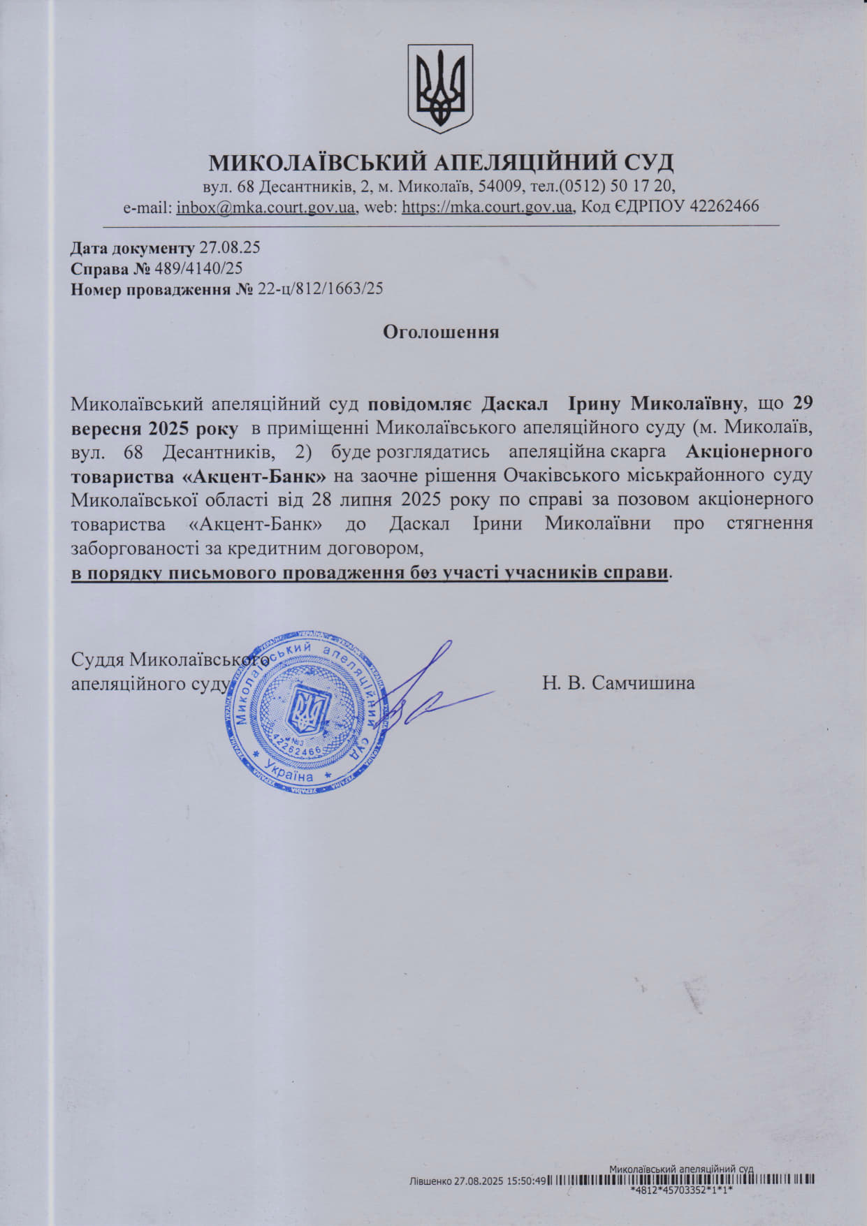 Повідомлення Даскал Ірину Миколаївну про розгляд апеляційного провадження 29 вересня 2025р.