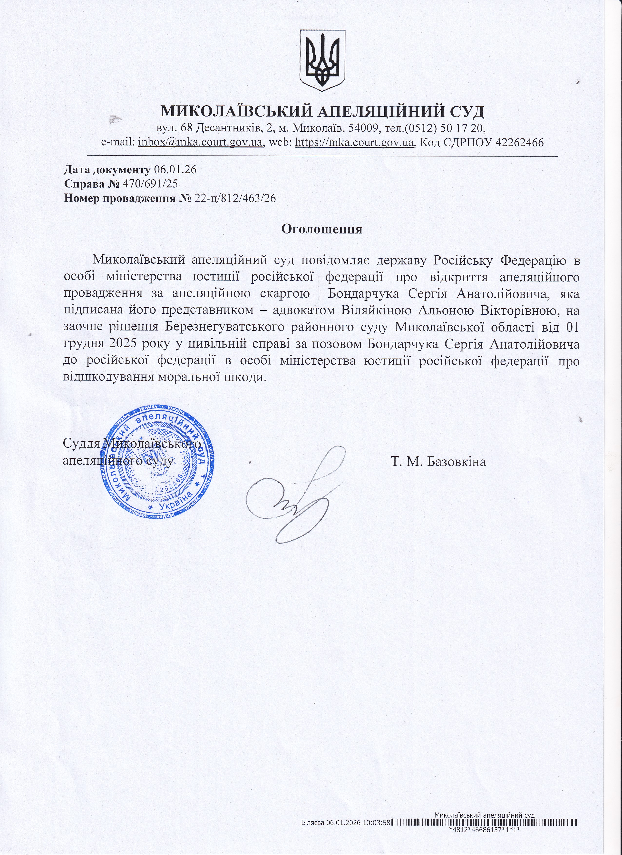 Повідомлення держави Російська Федерація про відкриття апеляційного провадження за скаргою Бондарчука