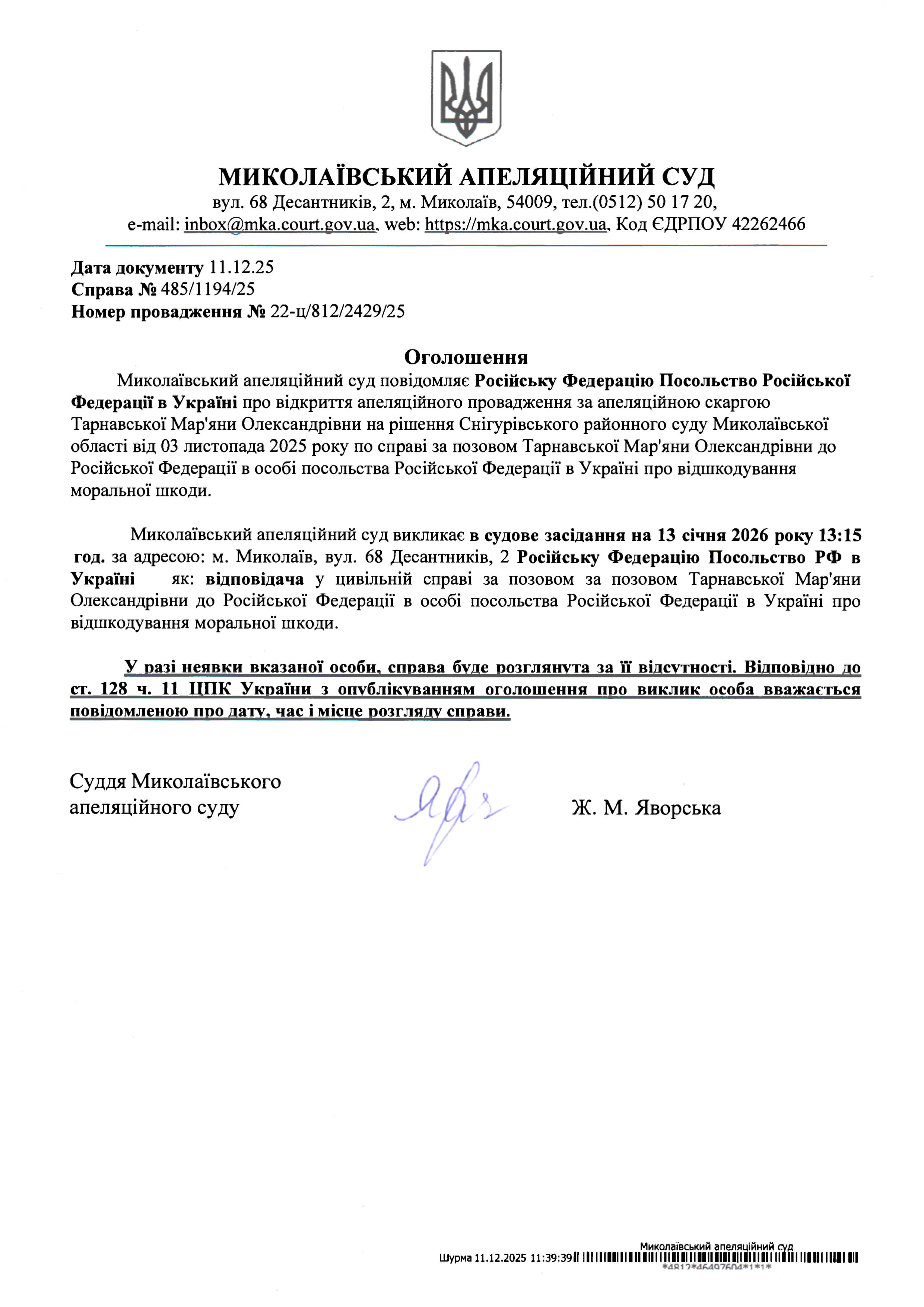Повідомлення держави Російська Федерація про відкриття апеляційного провадженн