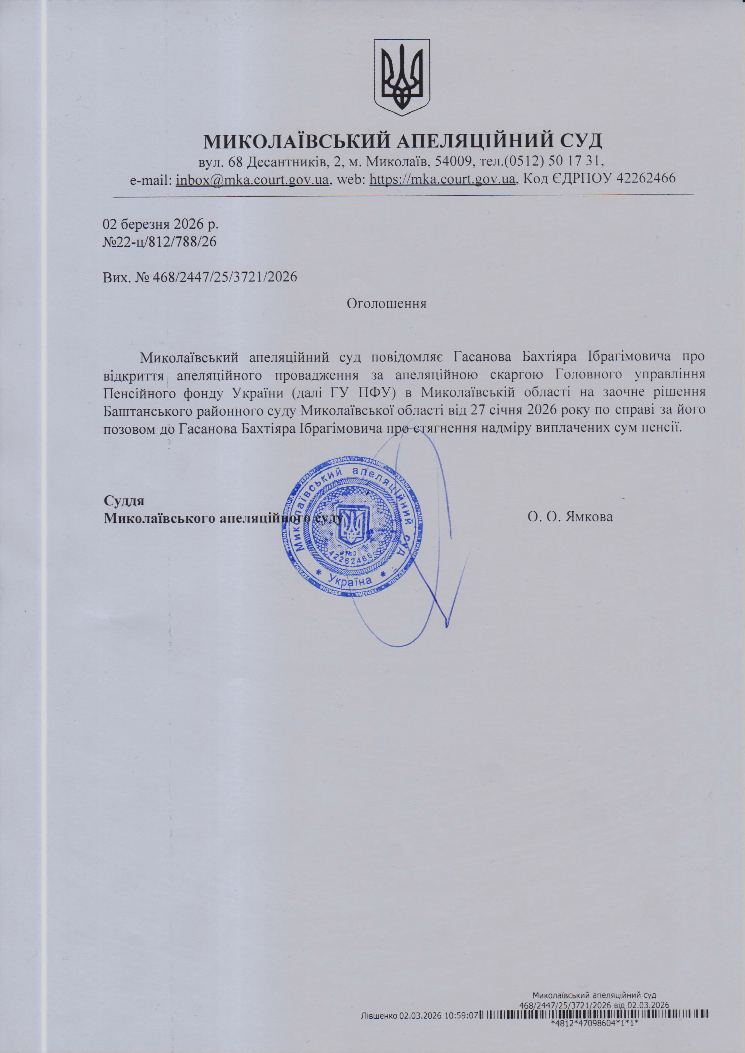 Повідомлення Гасанова Бахтіяра Ібрагімовича про відкриття апеляційного провадження за апеляційною скаргою Головного управління Пенсійного фонду України