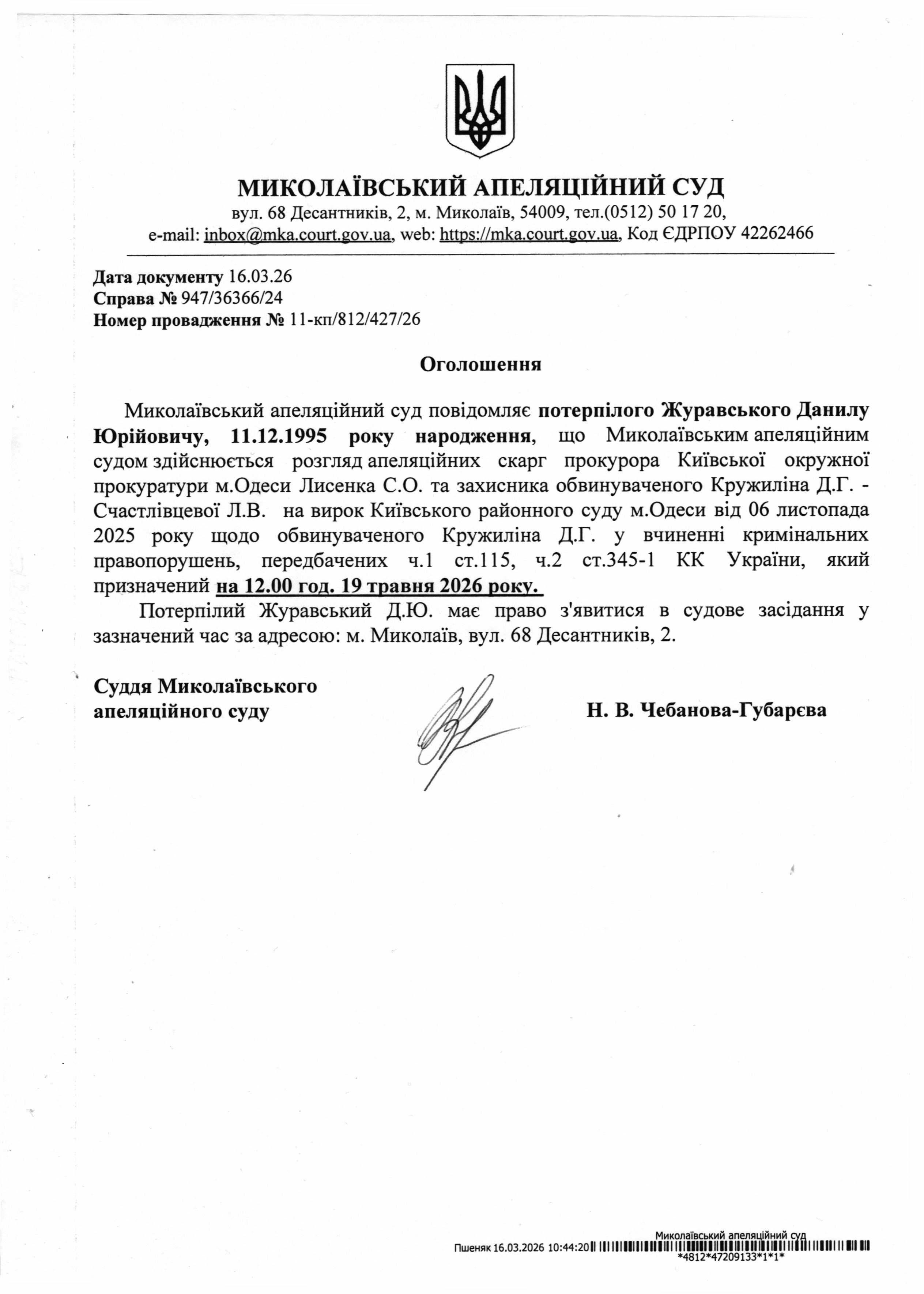 Повідомлення потерпілого Журавського Д.Ю. про розгляд апеляційної скарги призначений на 19 травня 2026 року
