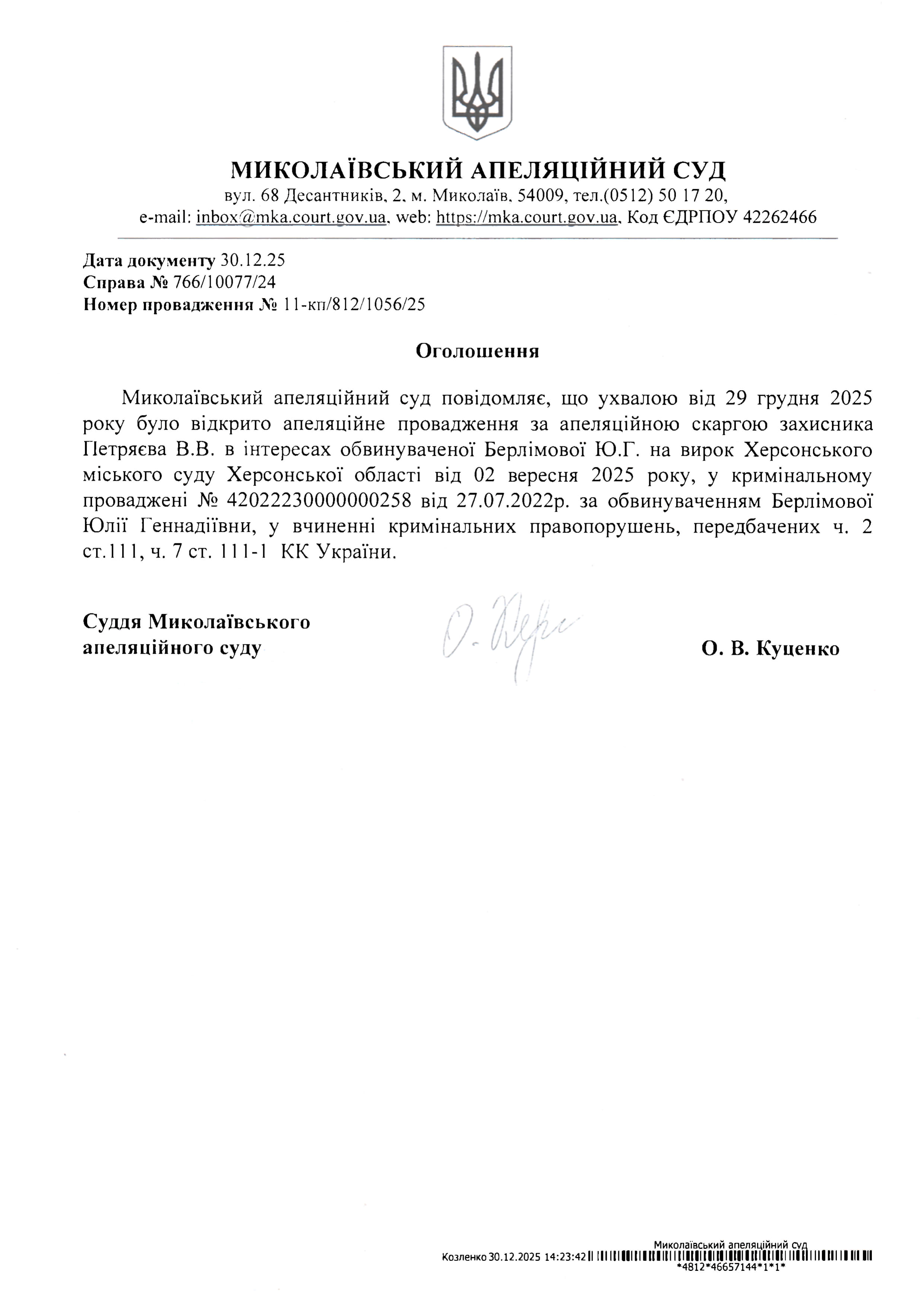 Повідомлення про відкриття апеляційного провадження за апеляційною скаргою захисника ГІетряєва В.В. в інтересах обвинуваченої Берлімової Ю.Г.