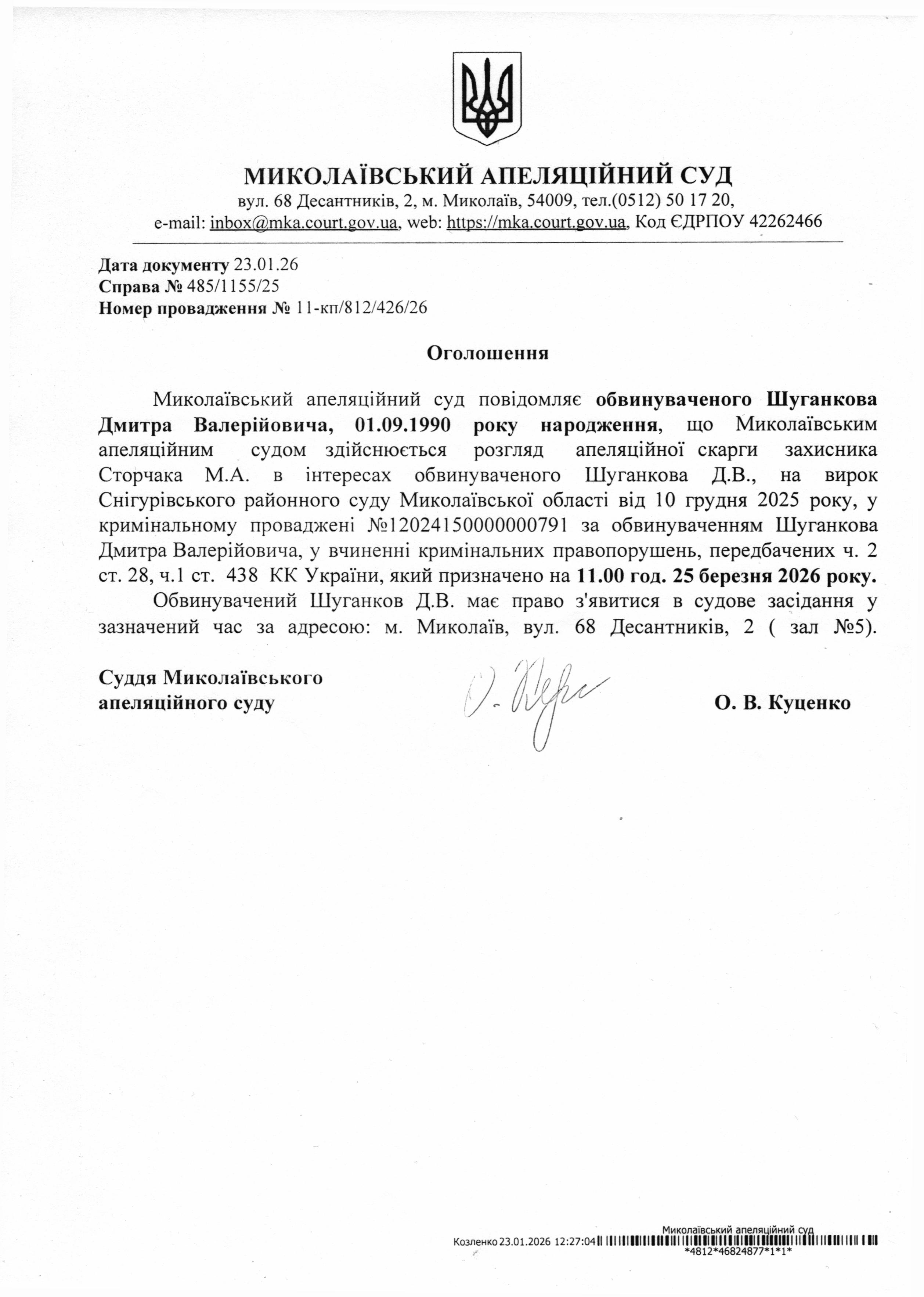 Оголошення про повідомлення Шуганкова Дмитра Валерійовича про розгляд апеляційної скарги