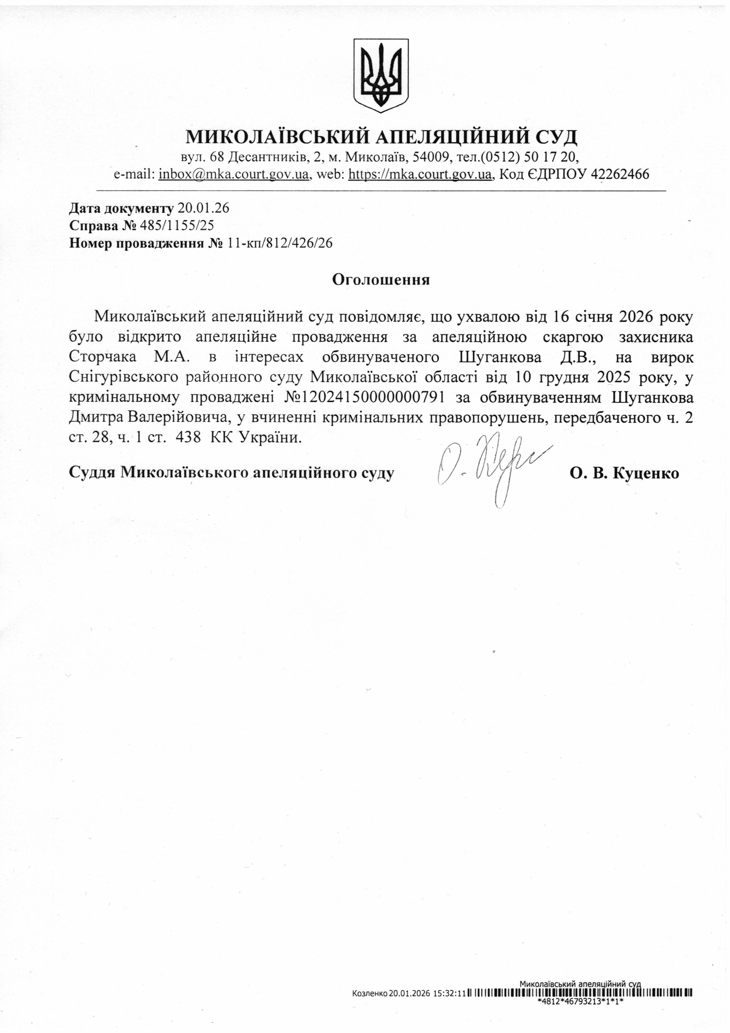 Оголошення Шуганкова Д.В. про відкриття апеляційного провадження